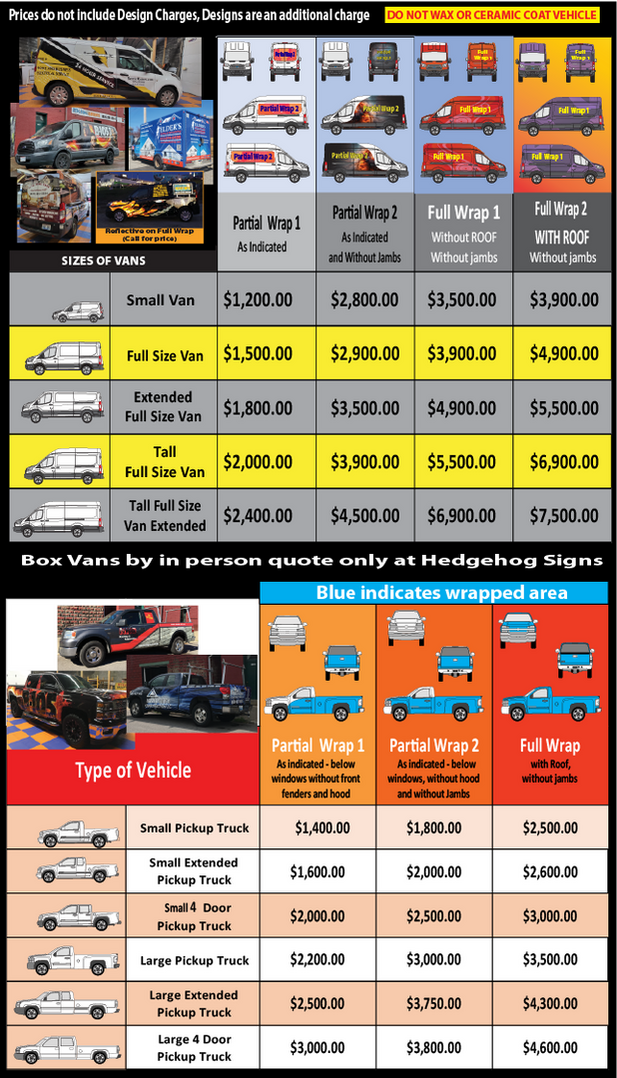 From cars to vans, to most modes of transportation, this is the last frontier that planning and zoning has not figured out how to tax, so take full advantage of it! Spend your advertising money on an eye-catching easy-to-read wrap. The design is the most important part, so take full advantage of Hedgehog Signs 30+ years of design experience. Vehicle wraps get more recognition than most other forms of advertisement. Prices listed below are general prices, other graphic configurations are available and can be quoted.​Call today and set up a consultation: 859-291-8544
